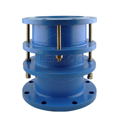 雙法蘭限位伸縮接頭是由本體、密封圈、壓蓋、伸縮短管等主要部件組成。在松套伸縮接頭原有性能的基礎(chǔ)上增設(shè)限位裝置,在大伸縮量處用雙螺母鎖定。管道在允許的伸縮量中可以自由伸縮,一旦超過其大伸縮量就起到限位,確保管道的安全運行,特別適用于有振動或有一定斜度及拐彎的管路中的連接。